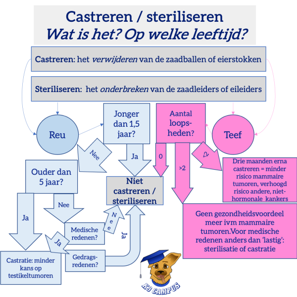 De meeste geslachtstumoren bij reuen en teven worden pas na de leeftijd van vijf jaar gezien. Het kan daarom zinvol zijn om te anticiperen op kankers en je hond vanaf de leeftijd van 5 jaar te castereren. Het gedrag is gevormd en de hormonen hebben de kans gehad om de hond volledig te doen uitgroeien zoals het hoort, waardoor de side effects van een castratie dan minimaal worden.