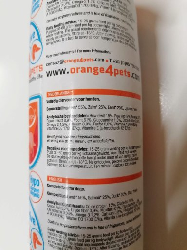 Orange4pets Sensitive is een vers vleesvoeding voor iedere hond van elke leeftijd, maar speciaal voor honden met een gevoelige huid/vacht en/of een gevoelige spijsvertering. De voeding bevat van nature aanwezige vitaminen, mineralen, spoorelementen, omegavetzuren, glucosamine en chondroitine.
